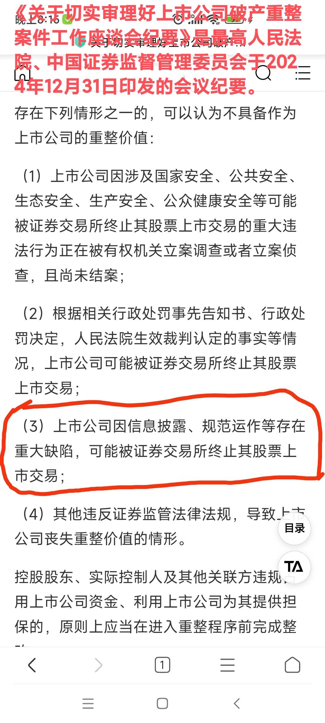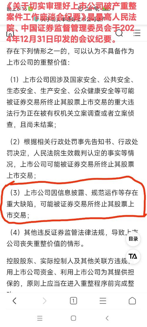 1、公司存在不符合重整条件的风险。公司虽已于前期推进预重整,但对照最高人民法院和中国证监会于2024年12月31日发布的《关于切实审理好上市公司破产重整案件工作座谈会纪要》(法(2024)309号)(以下简称“《重整纪要》”)予以自查,因公司已被立案调查,且存在重大违法强制退市的风险,属于《重整纪要》第9条“不具备作为上市公司的重整价值”的情形,公司存在不符合重整条件的风险。
