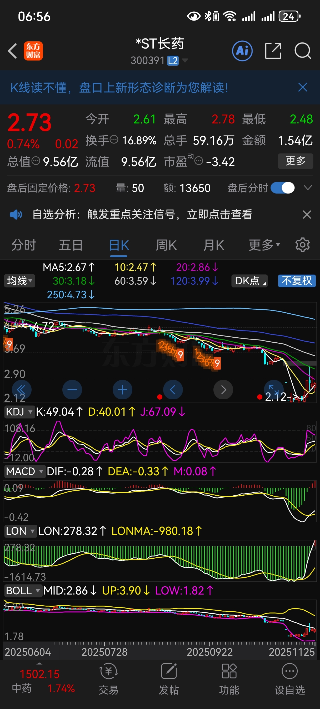 $*ST长药(SZ300391)$ 这均线压制下一直往下并且有立案调查涉嫌虚假记载财务造假股目前没有一个可以安全落地,基本上去了三板,按道理如果没有雷,又是破产重整这种利好按逻辑应该在均线上震荡