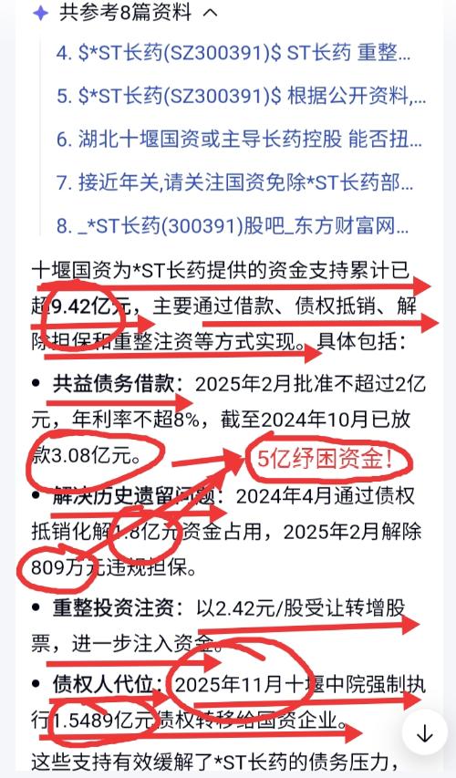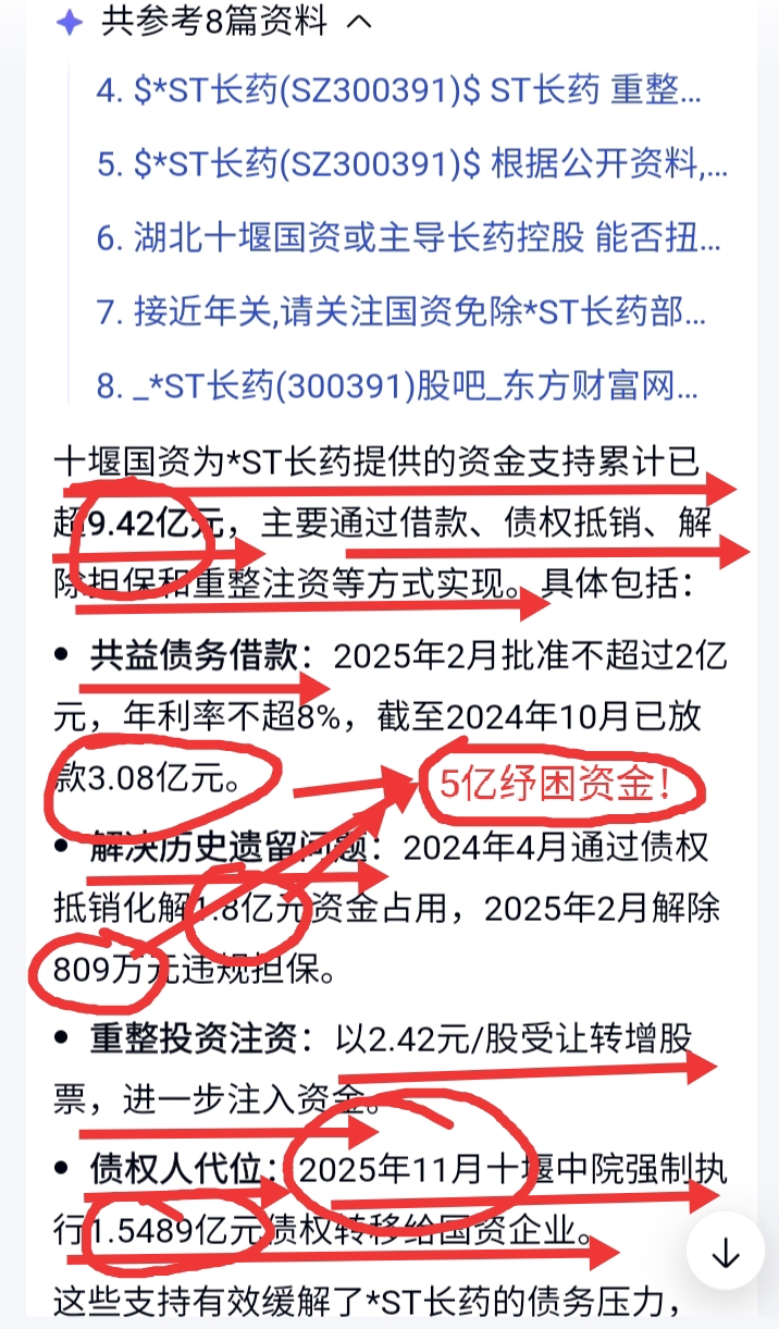 $*ST长药(SZ300391)$$*ST东易(SZ002713)$$*ST正平(SH603843)$经过仔细研究和深刻反思,长药可能成大妖!为什么走成现在这个样子,主要原因是立方带崩下来+主力庄家极致打压+收集低价带血割肉筹码!下周真像即将浮出水面!只说几点逻辑推理和分析佐证!第一,所有人最关心的问题,是否真的有强退可能?经过大妖师逻辑倒推,可能性不大!为什么这么说呢?你想想看,如果真的可能强退,为什么立案这么久了,债务重整没有终止?为什么产投和财投没有撤资退出?去年有一个债务重整退市股,不记得是哪只了,就是触及财务强退风险立案,后面产投和财投陆续公告退出!毕竟公司高层及重整方会第一时间了解立案调查内情的!你们懂得,不展开说!第二,为什么风险提示已经两周多快20天了没有公告?是不是已经没有大问题了!第三,十堰国资本已投入纾困资金5亿元了,12月10日公告又接手债权转移1.55亿!共6.55亿投入了!如果退市了,不是亏损更巨大吗?不是傻大头吗?相当于十堰国资已经是长药最大的兜底人!最大的债权人+最多借款人!十堰国资有什么底气敢如此做?真有强退可能,他敢又接盘1.55亿强制执行的债权转移?显然,不符合逻辑!第四,企查查发现,长江星12月3日,已由52.75%持股,变更为长药100%持股!说明长江星等七家子公司已完成注资,即将完成最后重整!这七家子公司完成重整,长药照样债务没了,十堰国资适当豁免,净资产就可以转正!当然就可以保壳去星了!后面再慢慢等结案后执行上市公司重整!这也反过来说,长药强退可能性不大了!第五,产投和财投没撤资退出,必定是十堰国资郑重承诺必全力保壳救长药!必全力完成子公司重整!否则产投财投早鸟兽散了!总计6.55亿债权和借款支助就是最后的保命法码!长药如果退了是没钱归还这些钱的!大不了全部免了,再找产投龚总赞助点,捐赠1亿现金资产!共7.55亿够净资产转正了吧?保住壳了,后面重整执行时多补偿些股份就可以了!大家可以去看看去年龚总开元重整的保壳去星模式吧!龚总有的是钱!他为什么立案后不退出呢?再次印证长药强退可能性不大!综合所以所有的逻辑倒推和依据佐证,长药下周时间内很大概率有重整或债务豁免公告!周一应该是最后的逢低买入机会!大妖师个人意见,仅供参考!