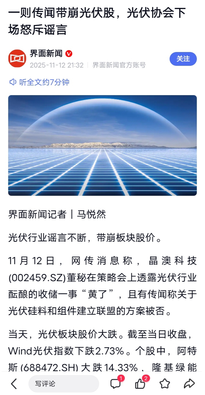 一则谣言竟然带崩整个光伏板块!好在有钙钛电池龙头仍逆市上行!官方紧急辟谣,誓言追
