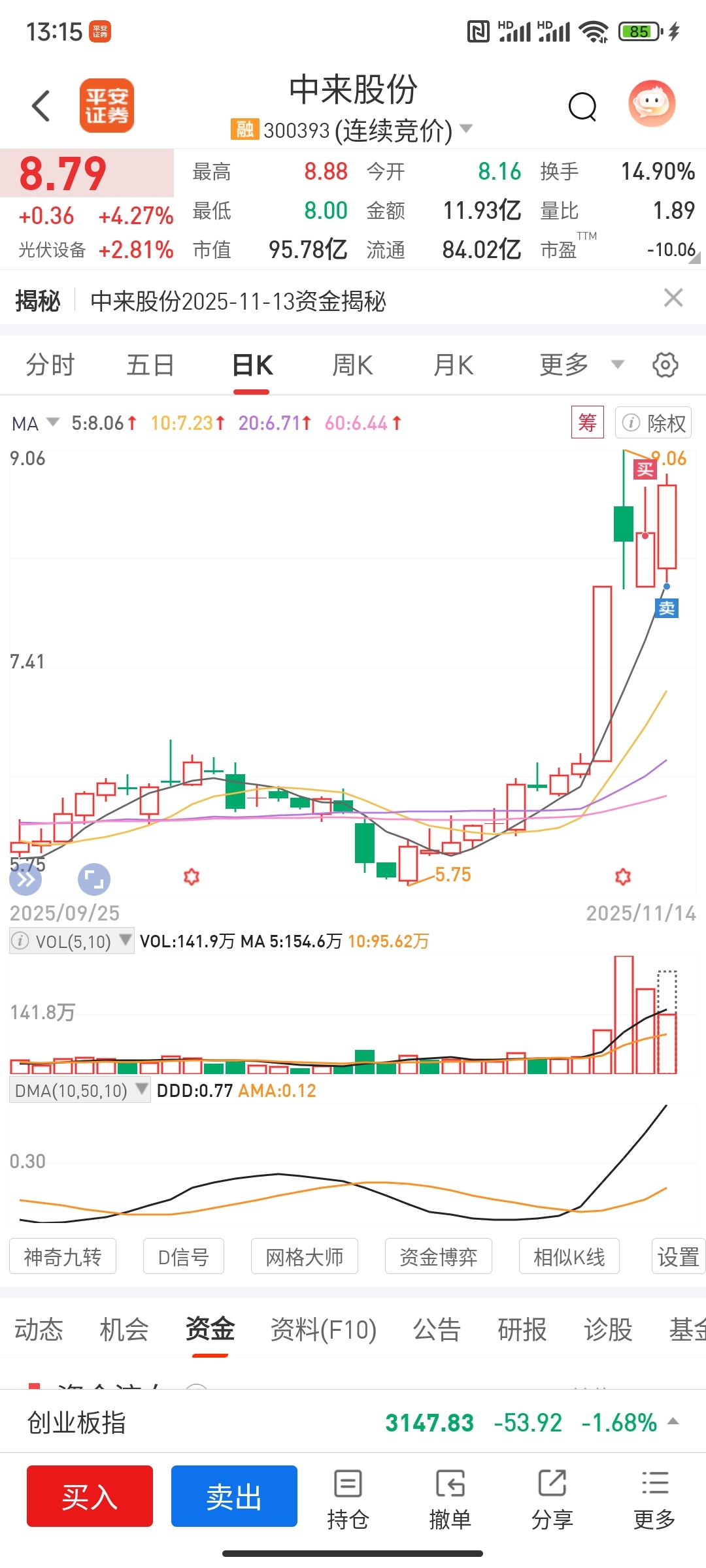 $中来股份(SZ300393)$ 早上卖了,现在拉升!谁能比我惨啊!