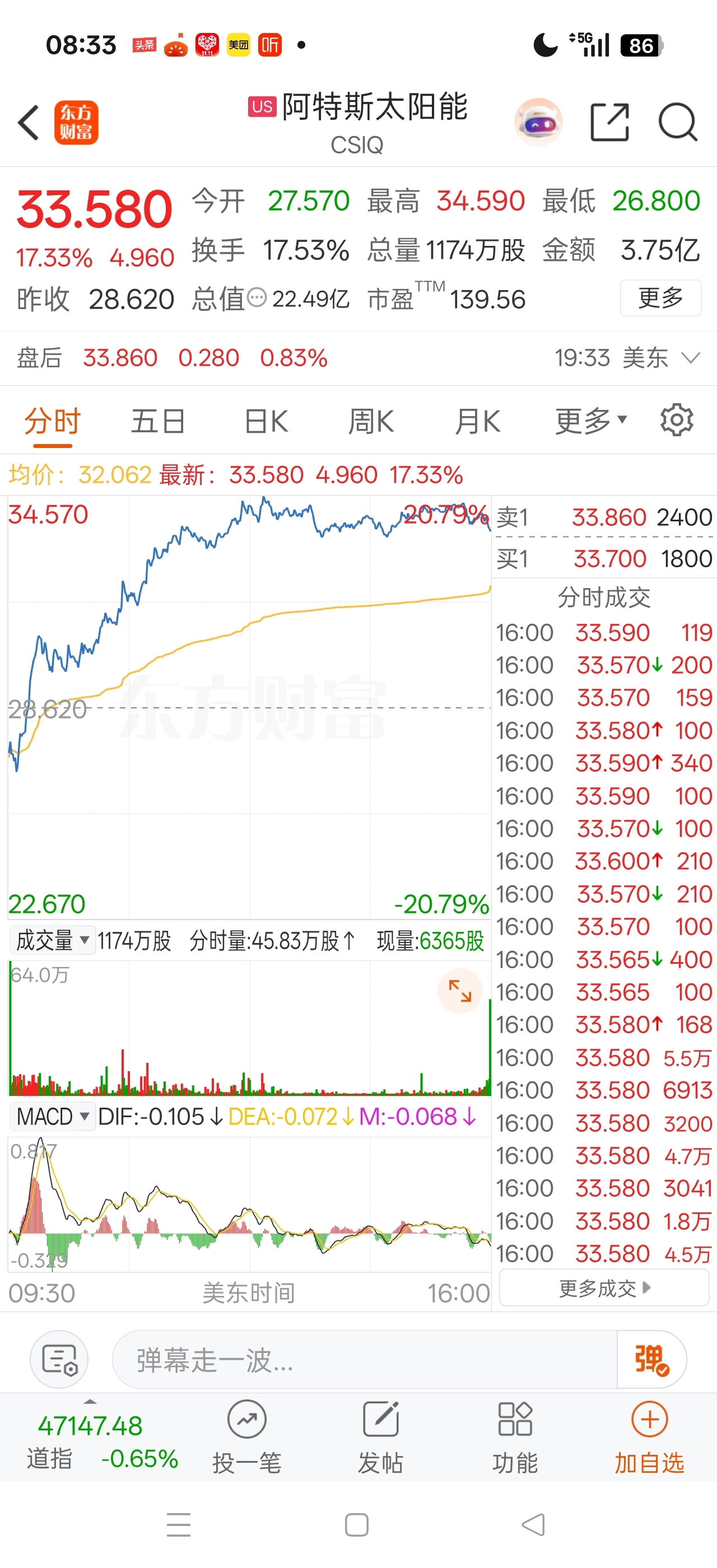 $中来股份(SZ300393)$ 龙头阿特斯太阳能隔夜逆转大涨17% 下周过10