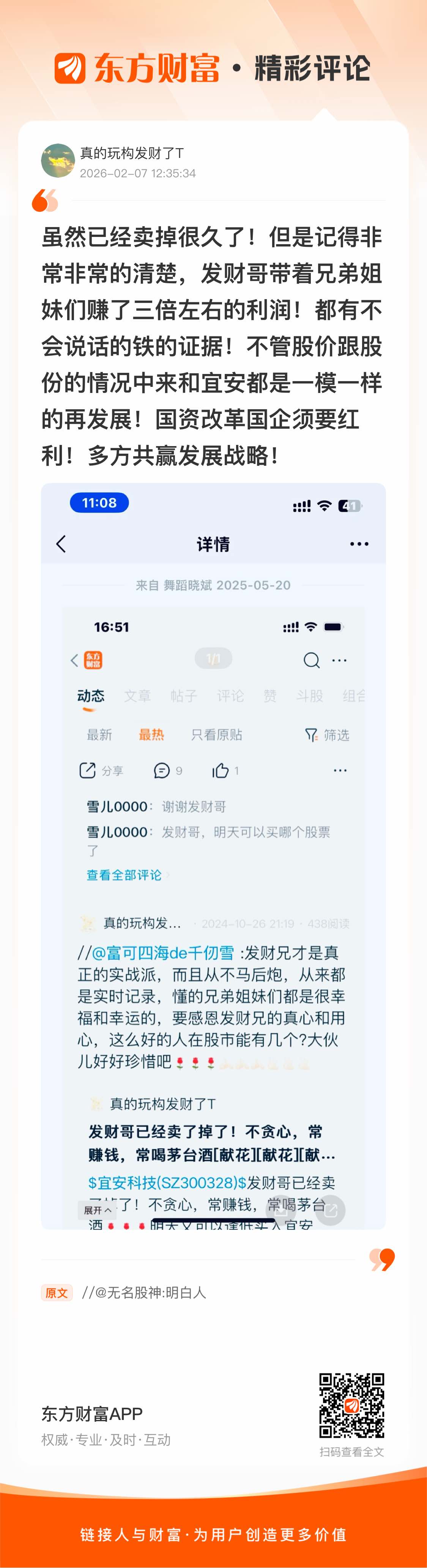 虽然已经卖掉很久了!再也没有关注!但是记得非常非常的清楚,发财哥带着兄弟姐妹们赚了三倍左右的利润!都有不会说话的铁的证据!不管股价跟股份的情况中来和宜安都是一模一样的再发展!国资改革国企须要红利!多方共赢发展战略!