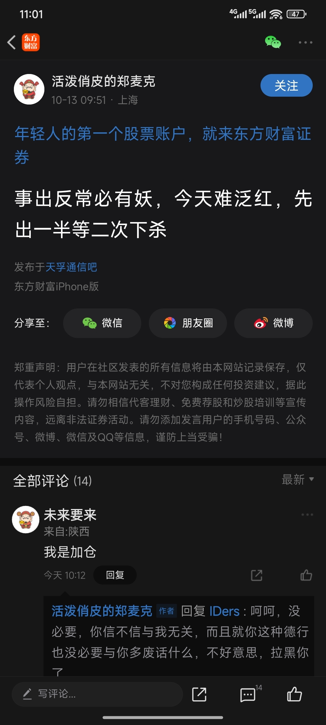 $天孚通信(SZ300394)$ 瞎吹牛皮的人可真多,这哥们说他158平盘附近减了半仓,说还要恐慌下跌一波。他自己9.50前发的贴,那时候最高价也就157且只有几秒钟,我让他晒个交割单,然后这人就破防了,说我没素质,然后把我拉黑了。哈哈哈!盲猜他是开盘被吓跑了然后一个劲鼓吹还要恐慌大跌