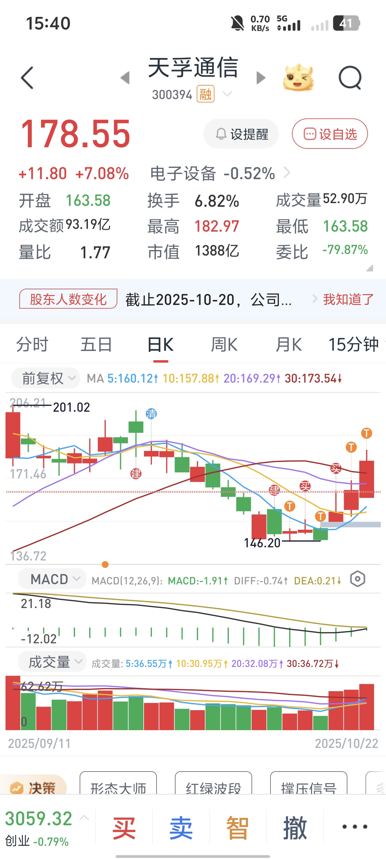 $天孚通信(SZ300394)$ 5000股,提心吊胆的看着红彤彤的帐户,才炒股6个月啊,你们嘴里的小白