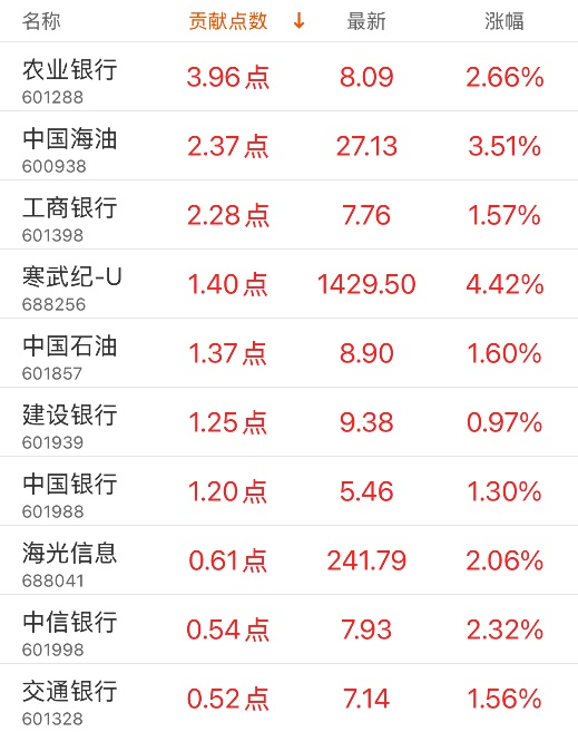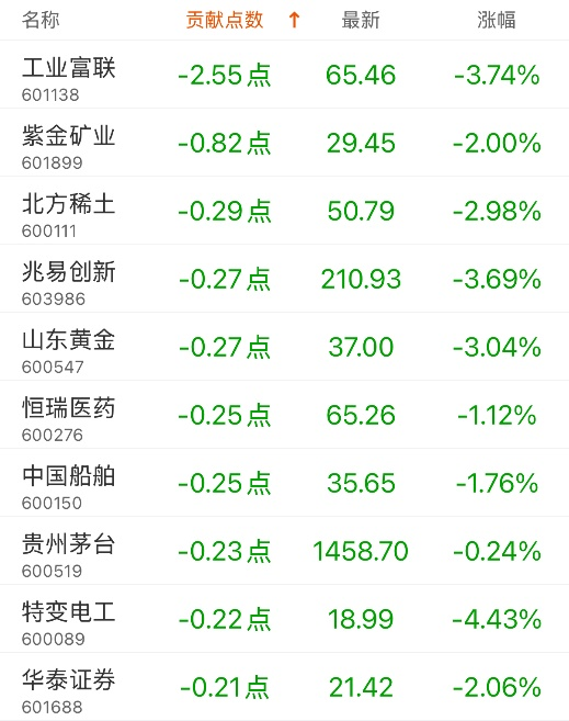 对上证指数贡献点数最多的个股是农业银行,贡献3.96点,该股当日涨2.66%,收盘价8.09元;拖累点数最多的个股是工业富联,拖累2.55点,该股当日跌3.74%,收盘价65.46元。
