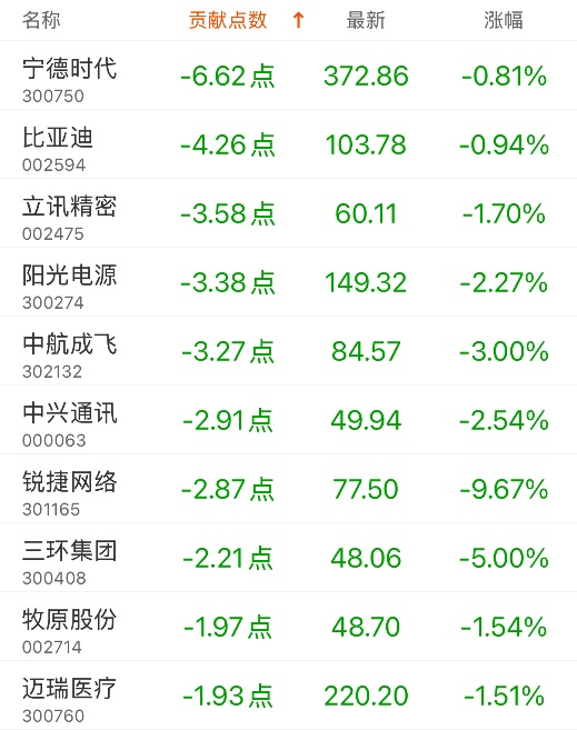 对深证成指贡献点数最多的个股是天孚通信,贡献4.72点,该股当日涨7.08%,收盘价178.55元;拖累点数最多的个股是宁德时代,拖累6.62点,该股当日跌0.81%,收盘价372.86元。