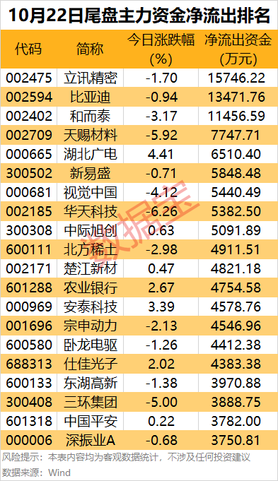 立讯精密、比亚迪和和而泰尾盘主力资金净流出均超1.1亿元,还有天赐材料、湖北广电、新易盛、视觉中国等热门股尾盘净流出金额居前。