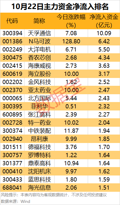 新股N马可波主力资金净流入6.42亿元,居次席。该股今日涨128.8%,龙虎榜数据显示,上榜营业部席位全天成交2.39亿元,占当日总成交金额比例为9.24%,合计净买入9020.05万元。