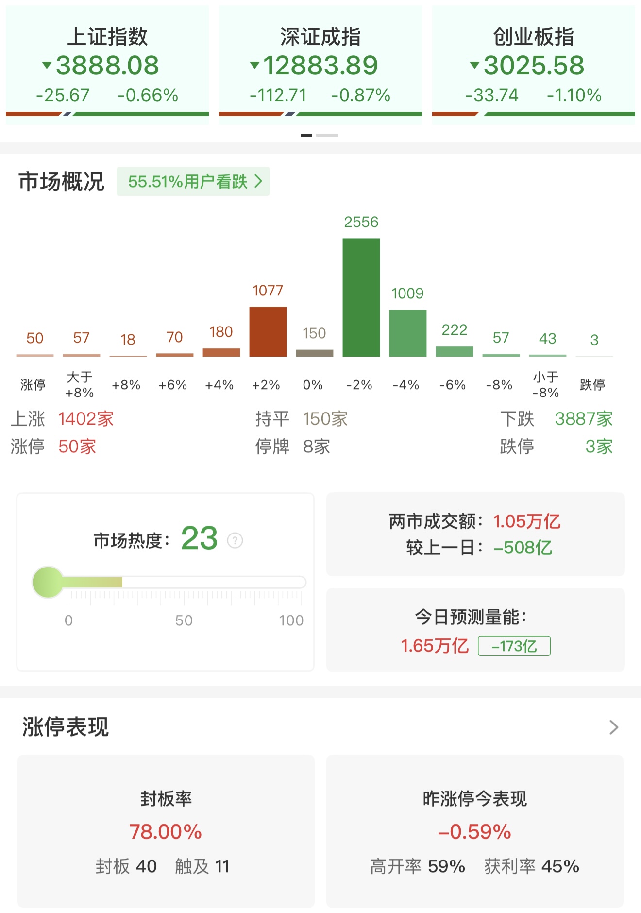 财联社10月23日电,市场早盘震荡调整,量能再度萎缩,沪深两市半日成交额1.05万亿,较上个交易日缩量508亿。盘面上热点较为杂乱,超3800只个股下跌。从板块来看,煤炭板块逆势走强,大有能源回封涨停晋级8连板,郑州煤电、辽宁能源等多股走出4天2板。深圳本地股集体上涨,深赛格等10余股涨停。传媒板块表现活跃,海看股份涨停。下跌方面,算力硬件方向集体下挫,CPO概念股领跌,天孚通信、长飞光纤等股大跌。超硬材料概念股走弱,力量钻石、四方达均跌近7%。板块方面,深圳国企改革、煤炭、文化传媒等板块涨幅居前,工程机械、CPO、贵金属等板块跌幅居前。截至收盘,沪指跌0.66%,深成指跌0.87%,创业板指跌1.1%。