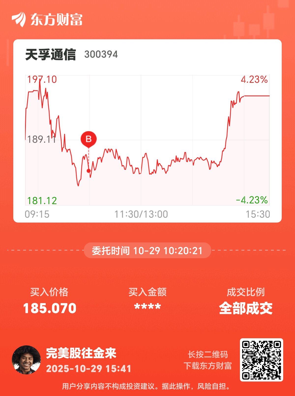 温馨提示: 1.根据《证券法》规定,禁止编造、传播虚假信息或者误导性信息,扰乱证券市场;2.用户在本社区发表的所有资料、言论等仅代表个人观点,与本网站立场无关,不对您构成任何投资建议。用户应基于自己的独立判断,自行决定证券投资并承担相应风险。《东方财富社区管理规定》