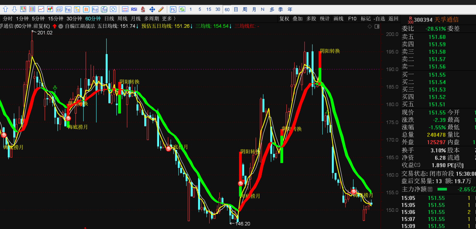 这个是天孚60分钟图,红色持股应该快出来了,你不出我不妄动,涨高回调跌深反弹是永远的节奏,虽然60分钟要出红色持股,但日线还早着呢