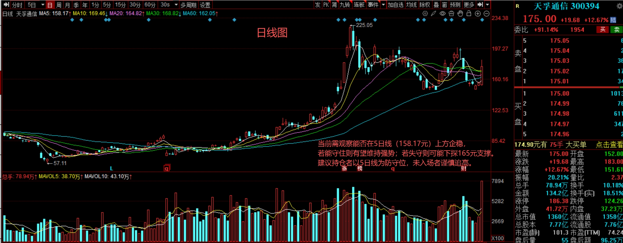 今日放量上涨突破5日线压制,收盘站稳175元关口。盘中冲高回落显示183元附近存在压力,当前需观察能否在5日线(158.17元)上方企稳,若能守住则有望维持强势;若失守则可能下探165元支撑。尽管大宗交易平价成交显示资金分歧,但高换手率预示交投活跃,建议持仓者以5日线为防守位,未入场者谨慎追高。