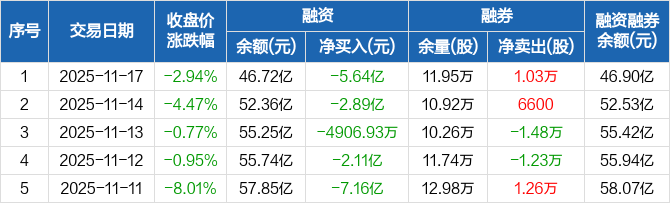 天孚通信融资融券信息显示,2025年11月17日融资净偿还5.64亿元;融资余额46.72亿元,较前一日下降10.78%。