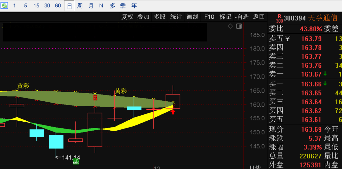 黄色依旧愿再接再厉,本周下方依旧看159这个位置,有人会说股价目前正在上涨,难道就要下跌了吗,今天我就告诉大家,我一般说下方价位时,不是马上就跌了,而是如果本周不管哪天只有股价收阴线就要考虑这个价位,
