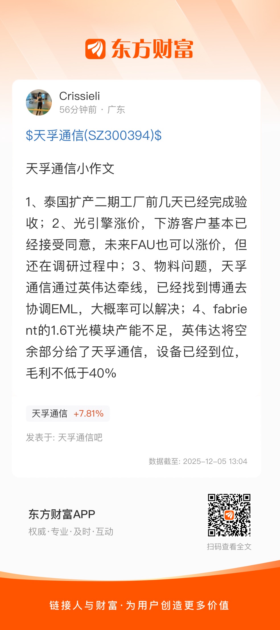 1、泰国扩产二期工厂前几天已经完成验收;2、光引擎涨价,下游客户基本已经接受同意,未来FAU也可以涨价,但还在调研过程中;3、物料问题,天孚通信通过英伟达牵线,已经找到博通去协调EML,大概率可以解决;4、fabrient的1.6T光模块产能不足,英伟达将空余部分给了天孚通信,设备已经到位,毛利不低于40%