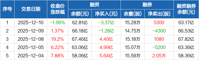 天孚通信:融资净偿还3.37亿元,融资余额62.81亿元(12-10)
