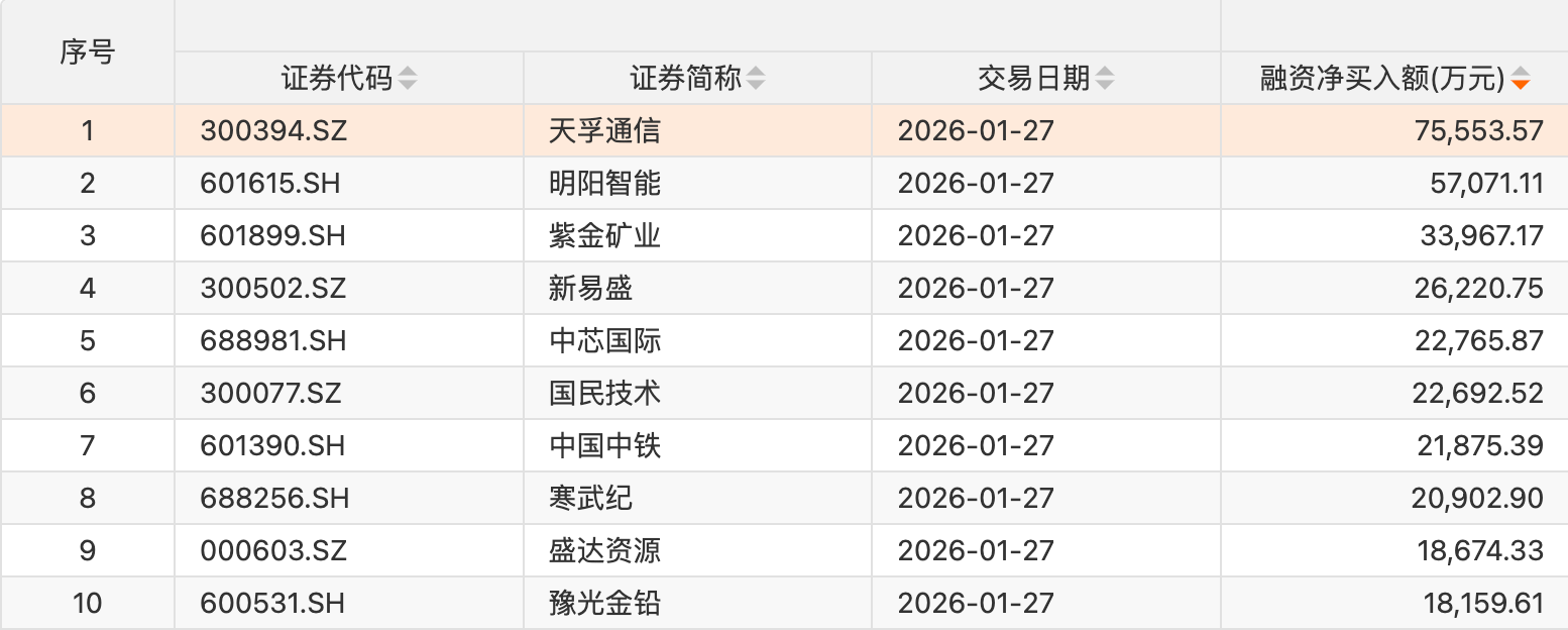 个股方面,41只个股获融资净买入额超1亿元。天孚通信获融资净买入额居首,净买入7.56亿元;融资净买入额居前的还有明阳智能、紫金矿业、新易盛、中芯国际、国民技术、中国中铁、寒武纪、盛达资源、豫光金铅等。