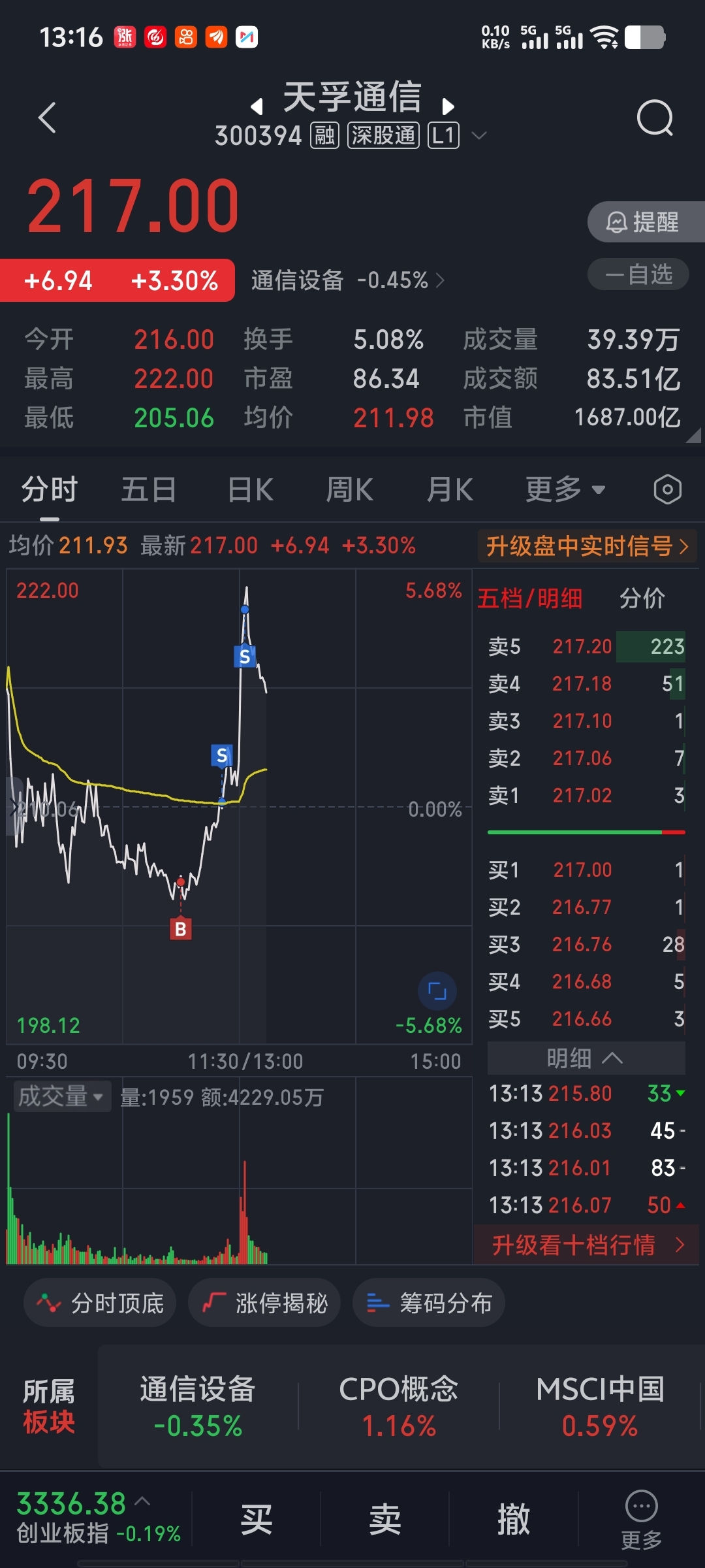 $天孚通信(SZ300394)$ 213没买进来有点可惜!要不尾盘就又卖了!