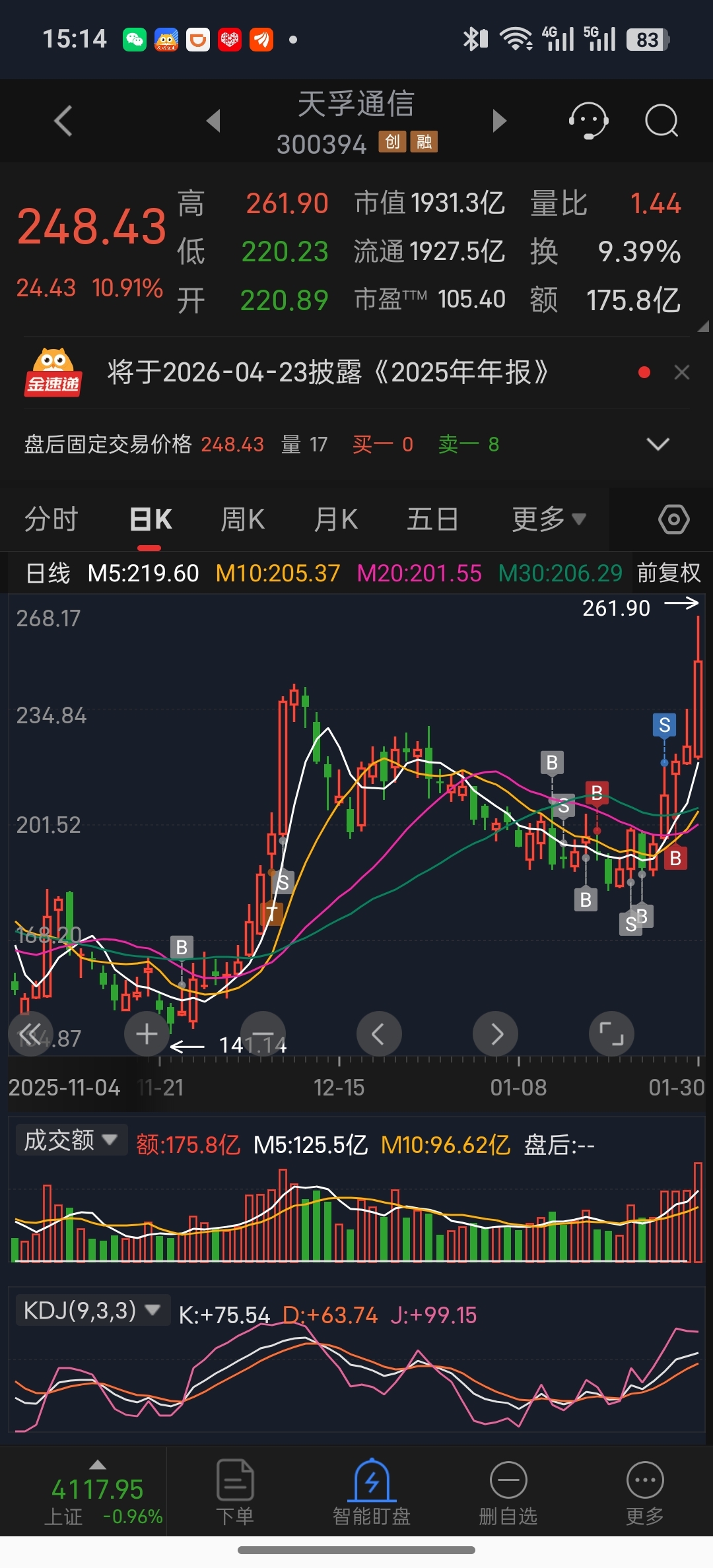 $天孚通信(SZ300394)$ 上次是150买的 238出的 这一波是187买的 今天挂258竟然卖掉了 担心下午涨停结果254又买回来了 不知道明天怎么样 cpo华工最烂 好久了 不见动还亏钱$联特科技(SZ301205)$ 联特科技是158卖掉了追不回来了 还有个$太辰光(SZ300570)$ 太辰光