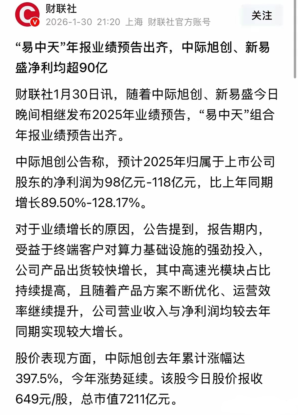 这组合炸裂的业绩,市场周五已经提前反应了,顶级游资扫货几十亿元,2月将可期实现业绩和股价的共振突破,所以还是要搞好中长线的价值投资,也不会被监管和停牌,继续长期看好2026年的CPO行情。