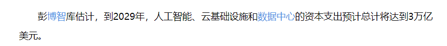 证劵时报网报道:彭博智库估计,AI投资到2029年高达3万亿美元。巨头投资数据基础设施抢占AI霸权