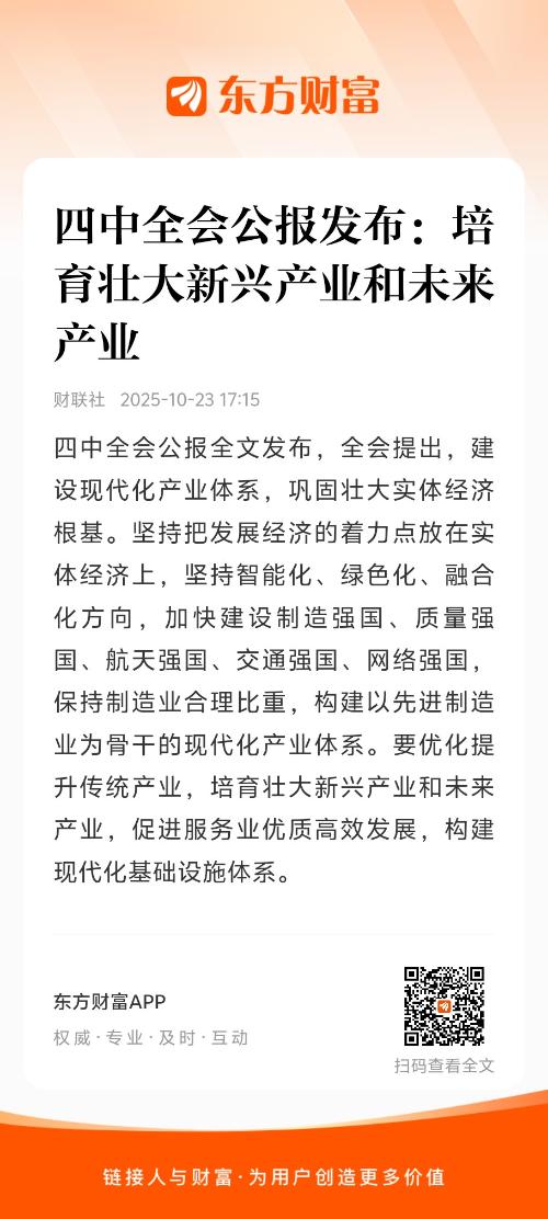 四中全会公报全文发布,全会提出,建设现代化产业体系,巩固壮大实体经济根基。坚持把发展经济的着力点放在实体经济上,坚持智能化、绿色化、融合化方向,加快建设制造强国、质量强国、航天强国、交通强国、网络强国,保持制造业合理比重,构建以先进制造业为骨干的现代化产业体系。要优化提升传统产业,培育壮大新兴产业和未来产业,促进服务业优质高效发展,构建现代化基础设施体系。