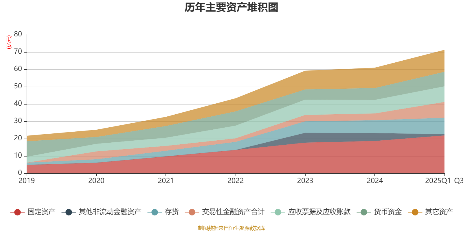 资产重大变化方面,截至2025年三季度末,公司其他非流动金融资产较上年末减少83.97%,占公司总资产比重下降6.42个百分点;交易性金融资产合计较上年末增加132.66%,占公司总资产比重上升6.37个百分点;在建工程合计较上年末减少14.51%,占公司总资产比重下降1.17个百分点;存货较上年末增加27.43%,占公司总资产比重上升1.1个百分点。