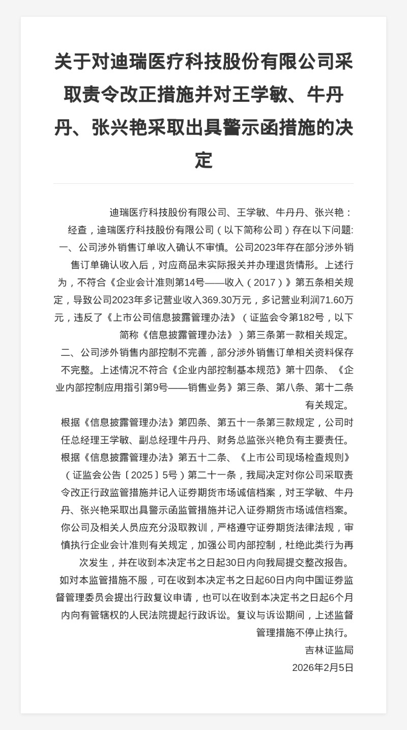 针对以上问题,吉林证监局决定对迪瑞医疗科技股份有限公司采取责令改正的行政监管措施并记入证券期货市场诚信档案,对王学敏、牛丹丹、张兴艳采取出具警示函的监管措施并记入证券期货市场诚信档案。