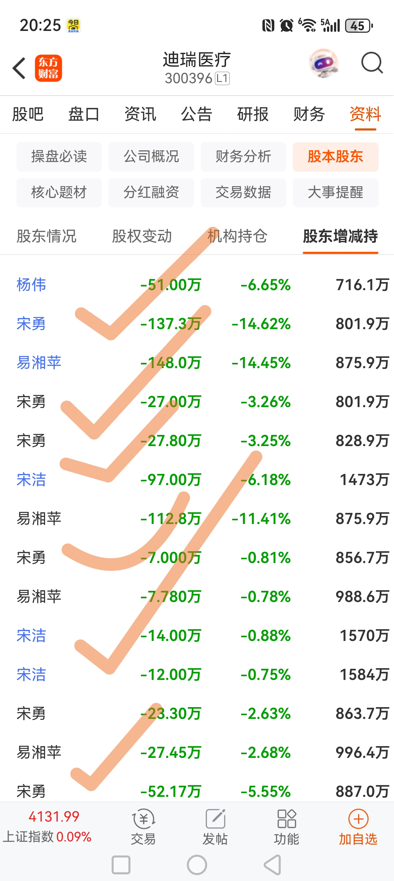$迪瑞医疗(SZ300396)$ 此股长期下跌的根本原因就是宋勇,宋洁长期减持套现,目前还有几千万没有减持,他们成本低的很,散户都成了接盘侠,一个个被深度套牢…目前非得把这些被套的散户洗干净了或者宋氏家族停止减持了才有可能涨,否则就是继续震荡下跌,要么就是长时间横盘