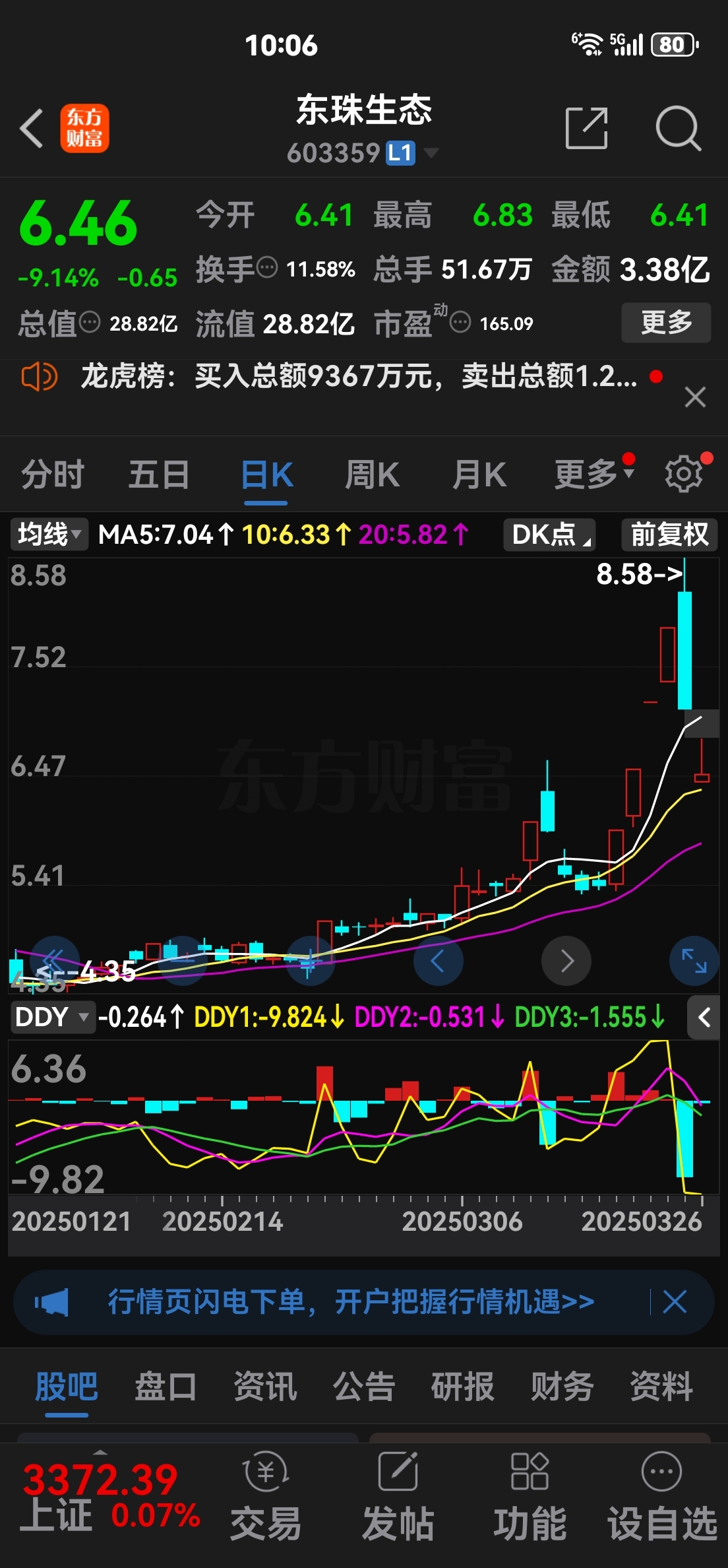 (技术贴)东珠生态昨天的8.58元我记忆犹新,没有好股烂股,只知道大盘啊不错,抄