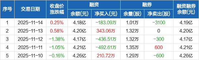 天和防务:融资净偿还183.09万元,融资余额4.18亿元(11-14)