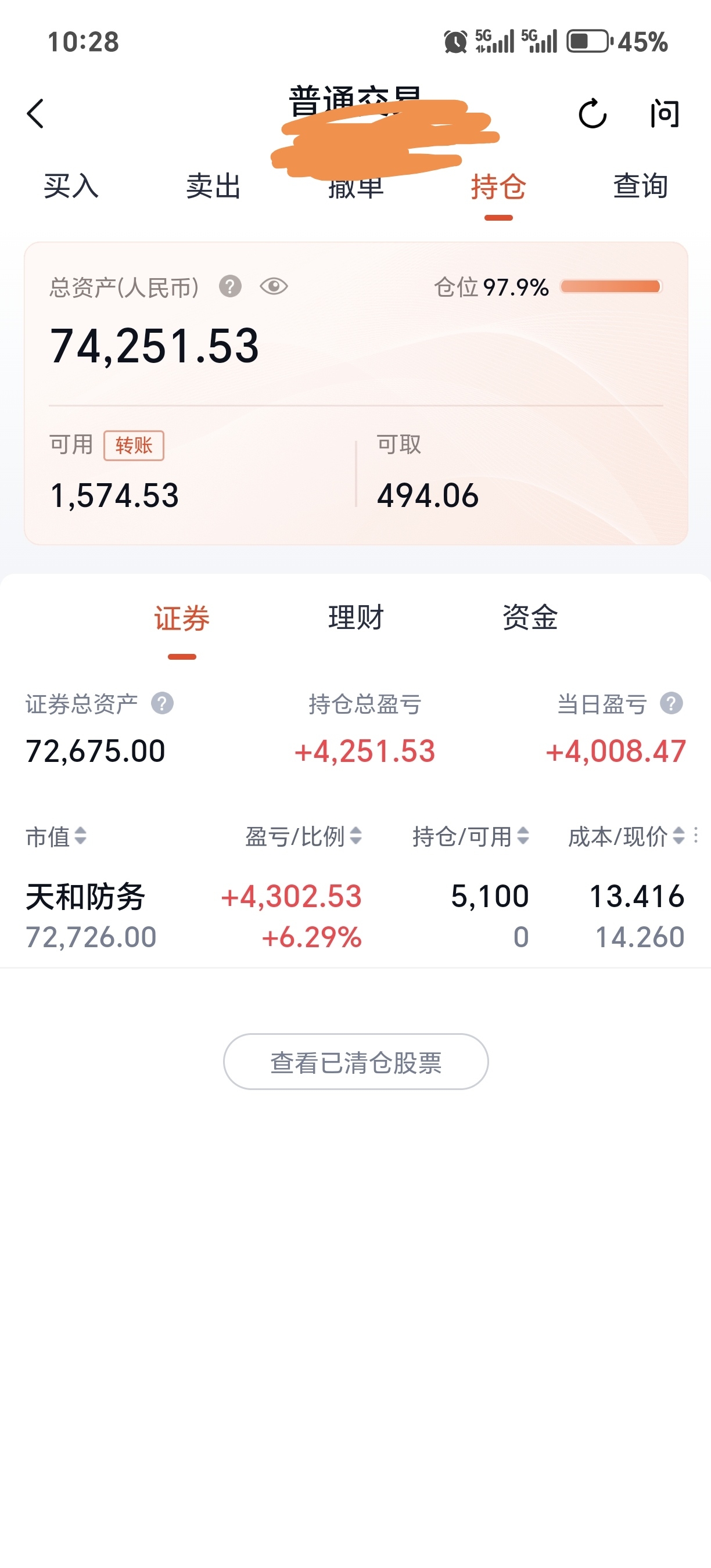 $天和防务(SZ300397)$ 7万炒股第二天,慢慢来吧,做个T