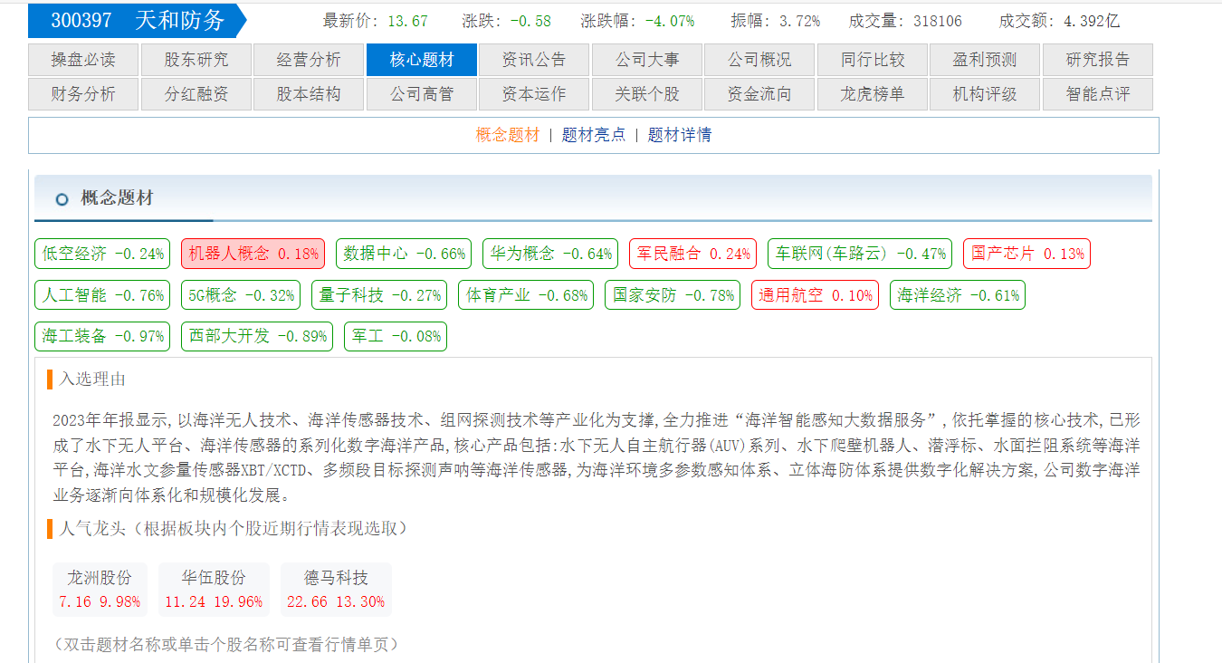 看看天各防务这概念,真不知道这家公司是如何选 入这些版块的,花钱上的概念吗?