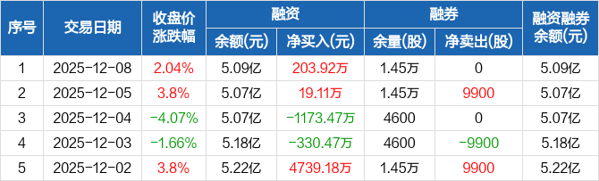 天和防务:融资净买入203.92万元,融资余额5.09亿元(12-08)