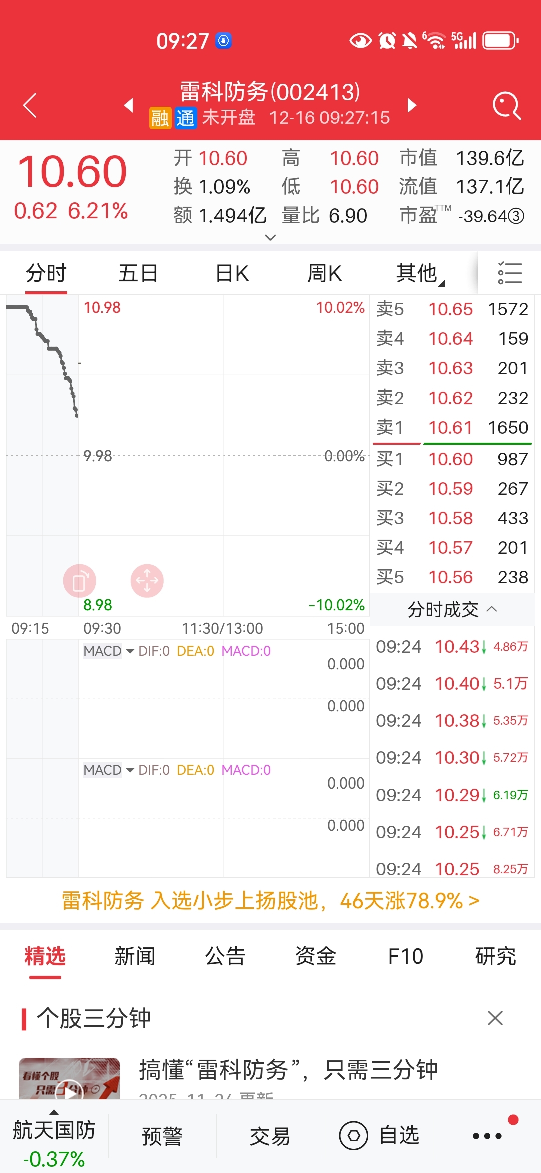 $天和防务(SZ300397)$ 雷科防务高开强势涨停,天和防务继续低开低走振荡下行