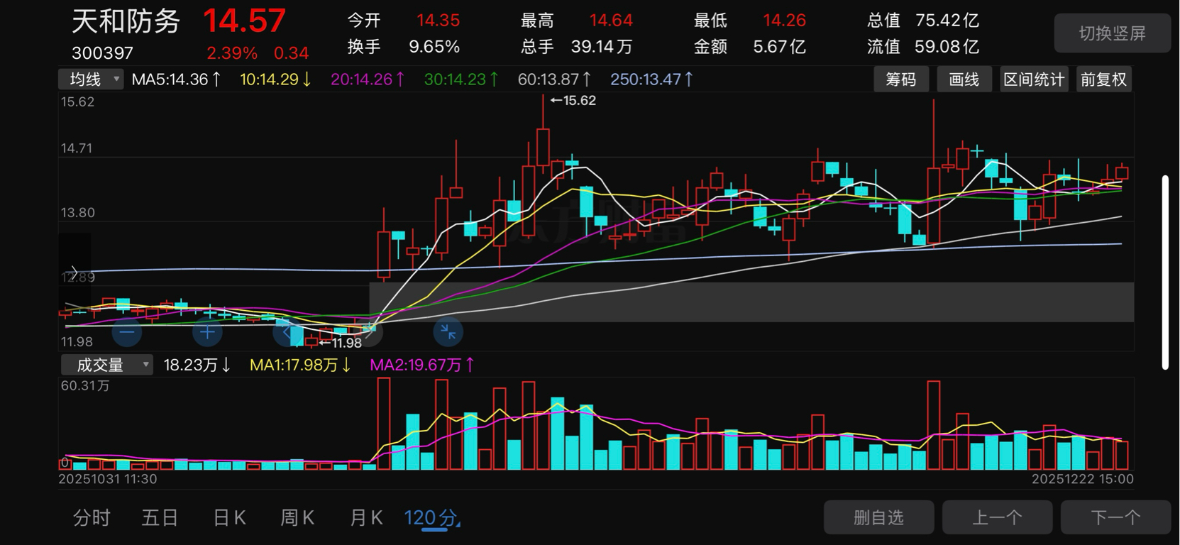 $天和防务(SZ300397)$ 120分钟k线走势,你说均线这样排列是涨还是跌?
