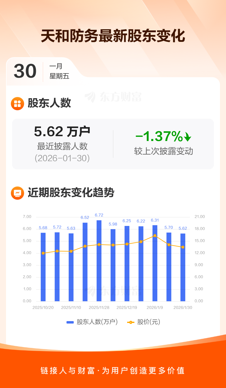 天和防务:截至1月30日最新股东户数5.62万户,较上期减少1.37%