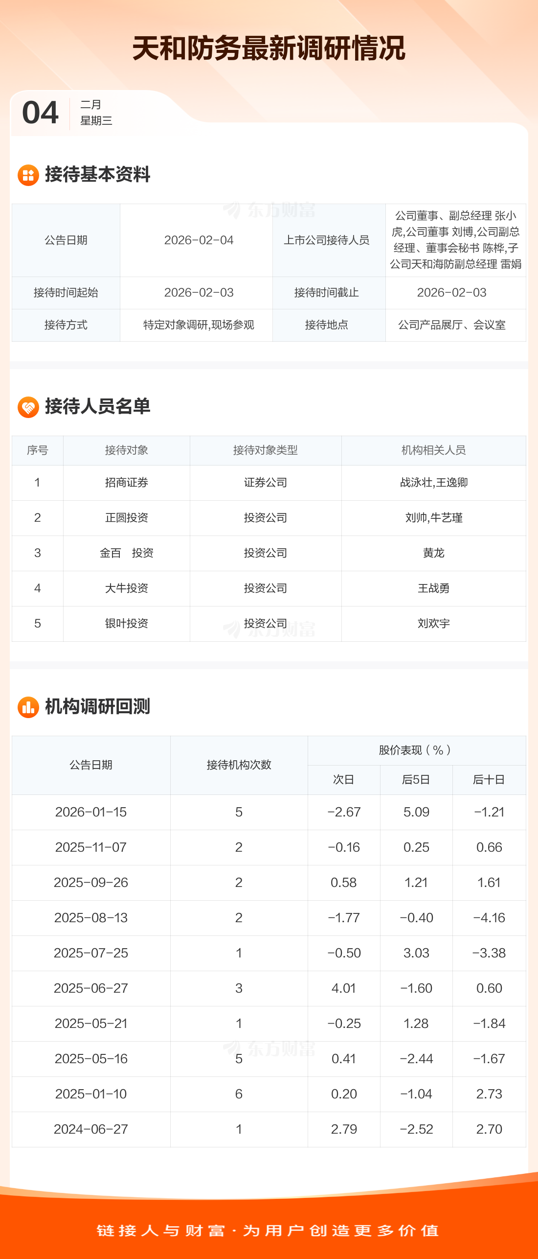 天和防务2月4日公告称,2月3日接待招商证券等5家机构调研。接待人员包括公司董事、副总经理 张小虎,公司董事 刘博,公司副总经理、董事会秘书 陈桦,子公司天和海防副总经理 雷娟。
