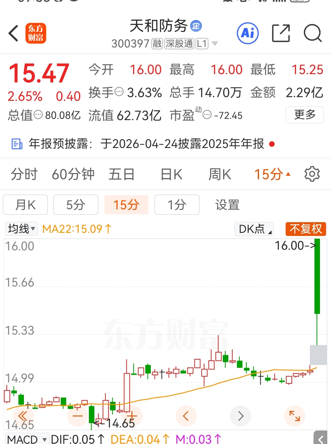 $天和防务(SZ300397)$ 第一,军工股,第二,创业板上限高。所以开盘买了一单,没想到,高开低走。