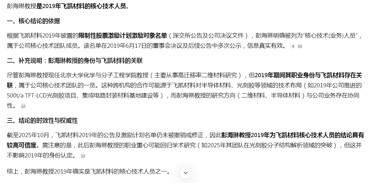 彭海琳教授是2019年飞凯材料的核心技术人员
