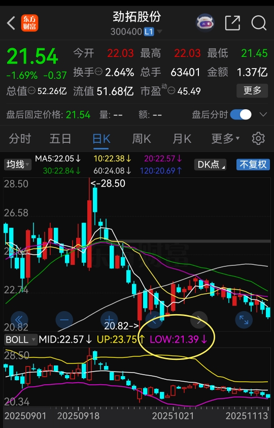 收盘后布林线下轨价21.39元!希望明天砸破下轨!