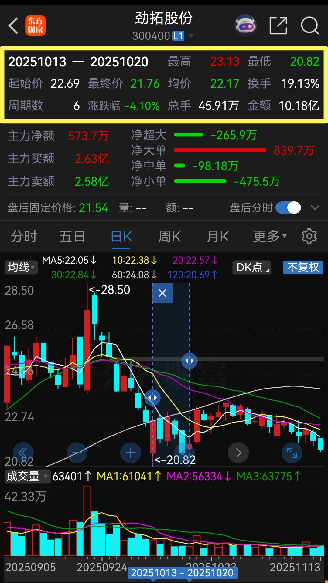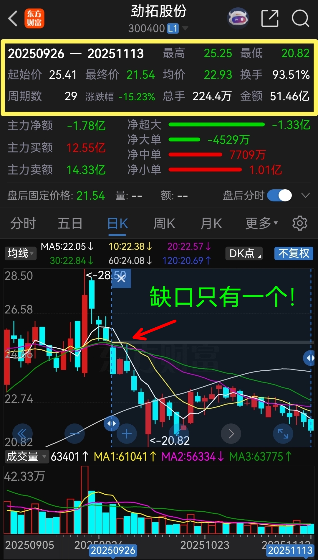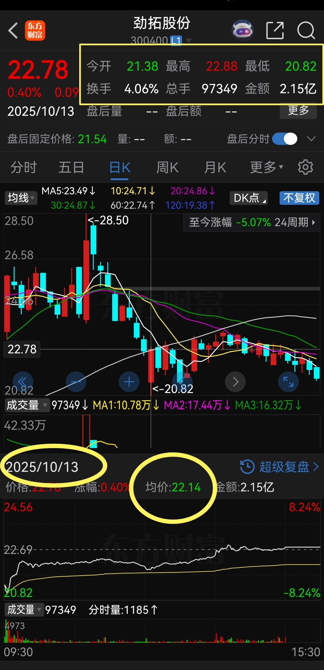 10月13日创下20.82元最低价位当天成交均价为22.14元,成交量换手4.06%,盼望明天周末效益劲拓股价去创个新低,给老鲨鱼个机会!