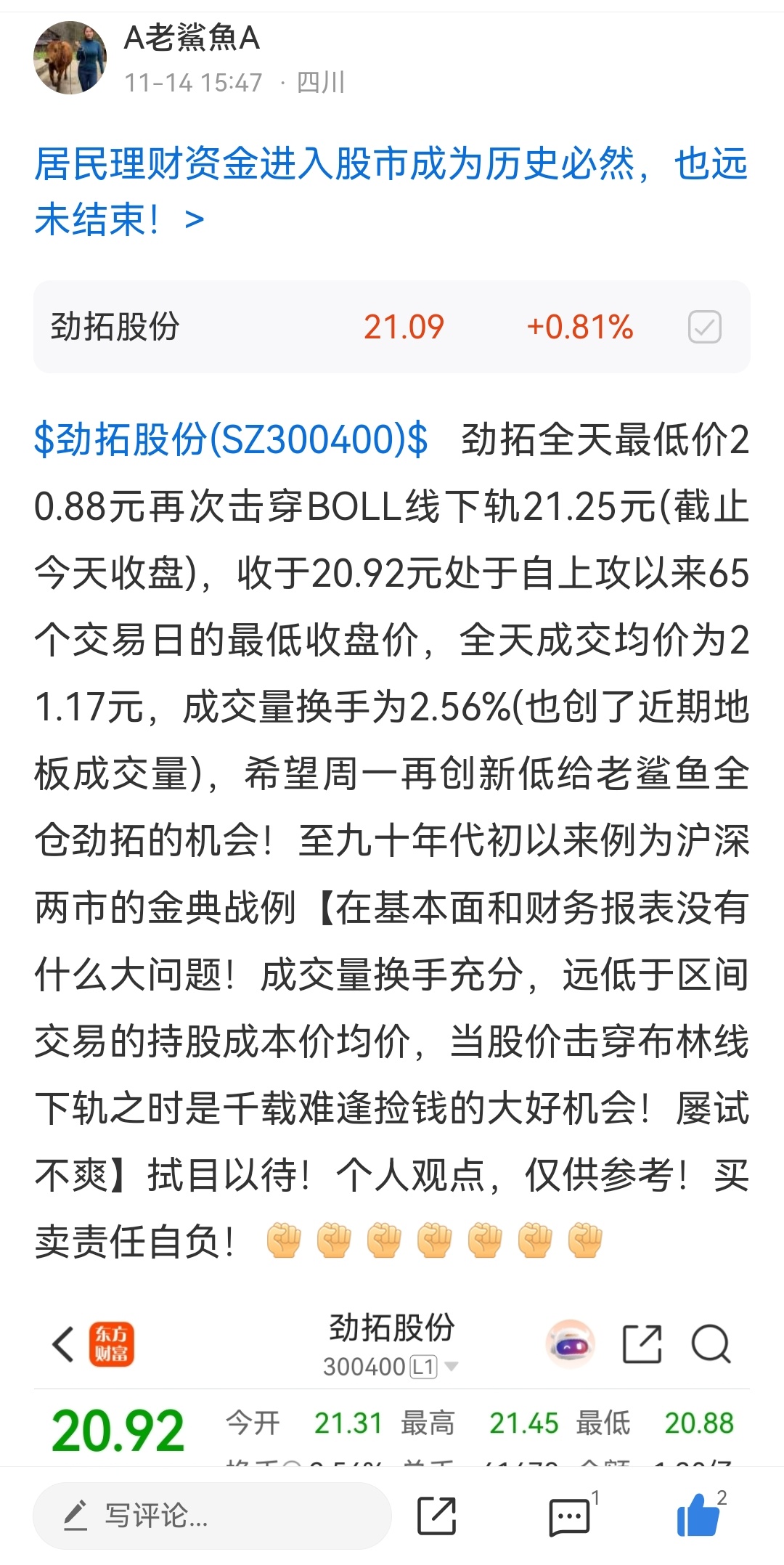 $劲拓股份(SZ300400)$劲拓全天最低价20.88元再次击穿 BOLL 线下轨21.25元(截止今天收盘),收于20.92元处于自上攻以来65个交易日的最低收盘价,全天成交均价为21.17元,成交量换手为2.56%(也创了近期地板成交量),希望周一再创新低给老鲨鱼全仓劲拓的机会!至九十年代初以来例为沪深两市的金典战例【在基本面和财务报表没有什么大问题!成交量换手充分,远低于区间交易的持股成本价均价,当股价击穿布林线下轨之时是千载难逢捡钱的大好机会!屡试不爽】拭目以待!个人观点,仅供参考!买卖责任自负!