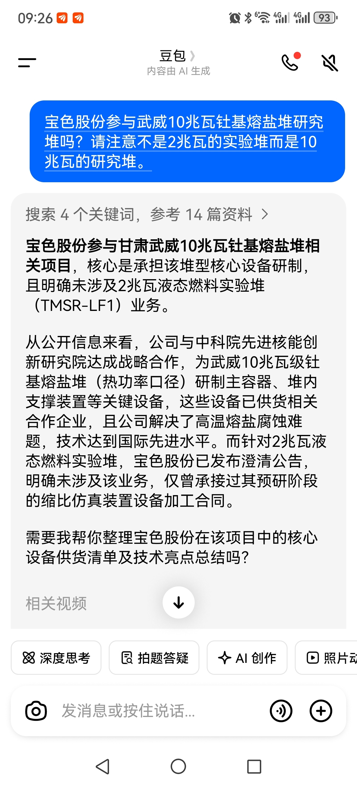 $宝色股份(SZ300402)$ 宝色股份参与了钍基熔盐堆的仿真堆,但没参与2兆瓦实验堆,但最重要的是参与10兆瓦研究堆。