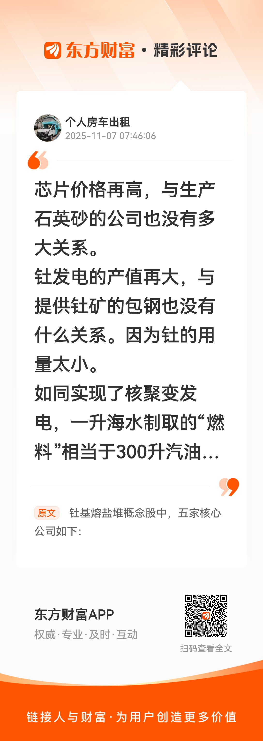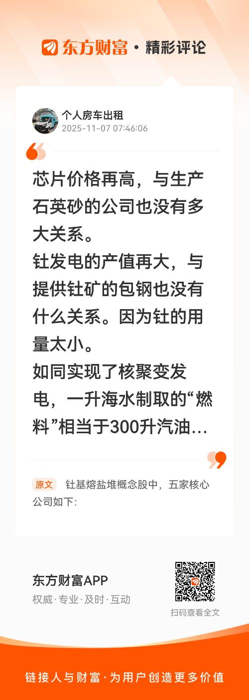 芯片价格再高,与生产石英砂的公司也没有多大关系。钍发电的产值再大,与提供钍矿的包钢也没有什么关系。因为钍的用量太小。如同实现了核聚变发电,一升海水制取的“燃料”相当于300升汽油,但是一升海水的售价会增加到300升汽油的售价吗?永远都不会! 我在《钍基熔盐堆概念股中,五家核心公司如下:》的评论获得了大家的关注。