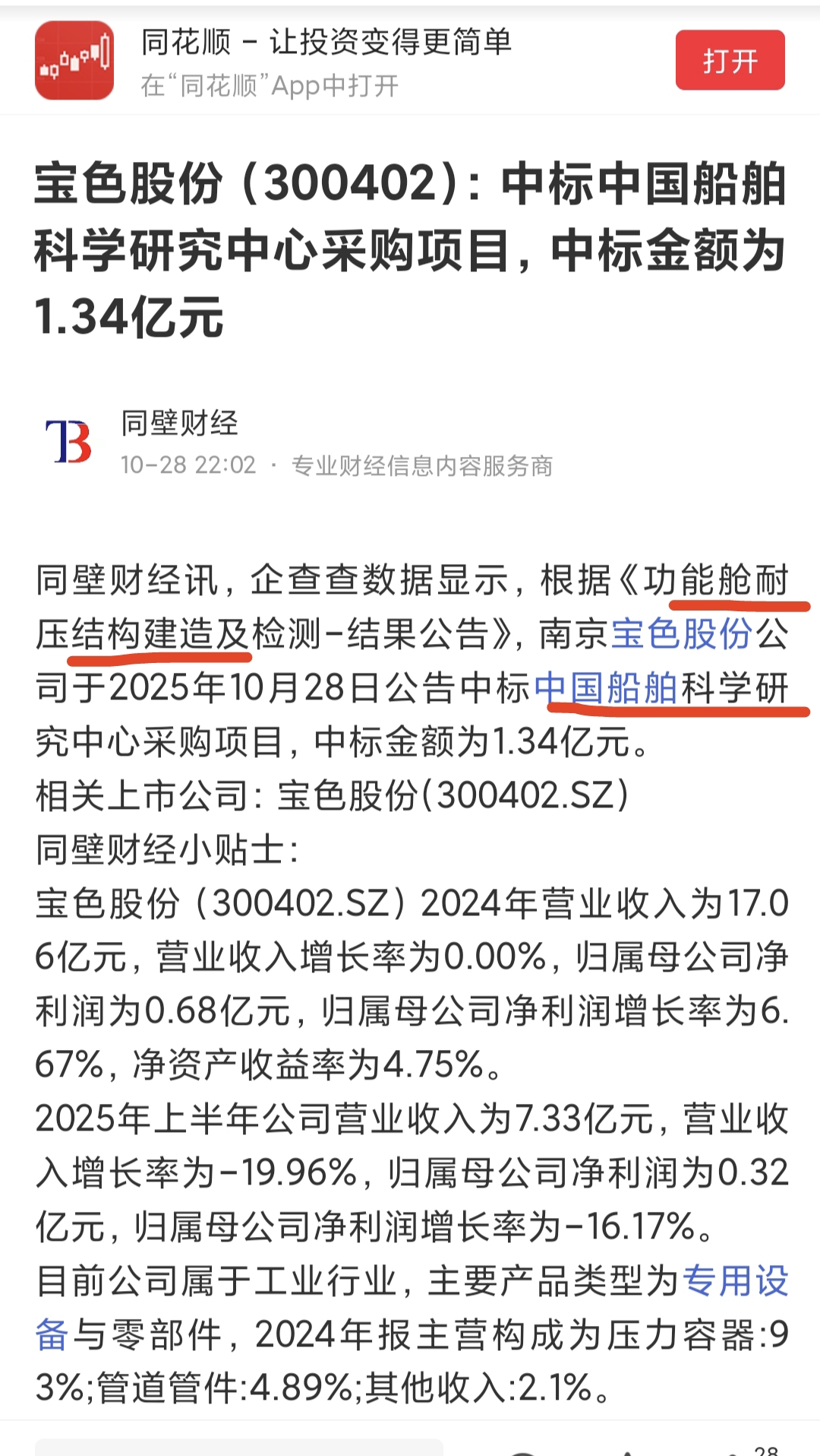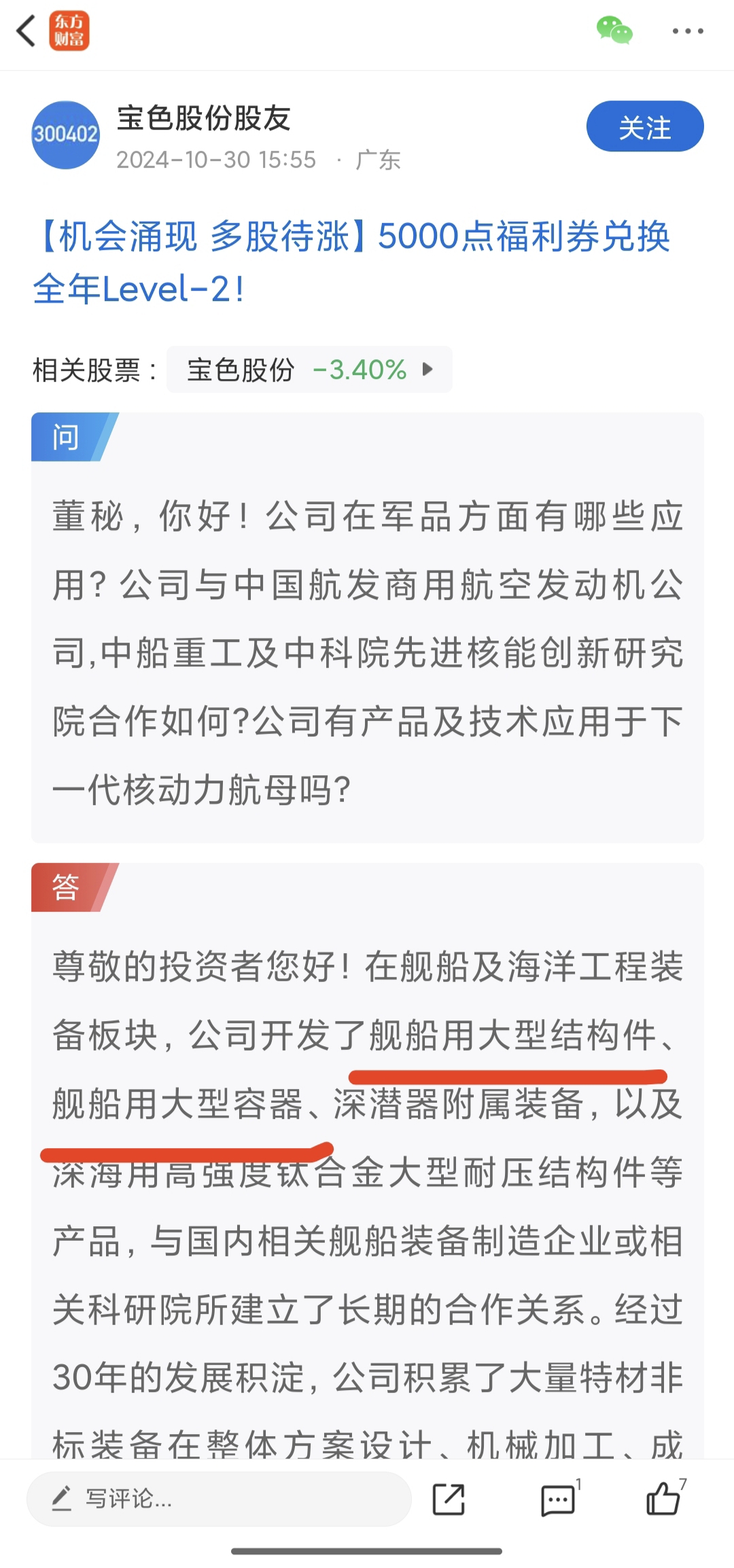 综上官方信息回答推论猜测宝色股份有为舰船大型结构件业务的技术支撑和大型舰船建造主体长期合作关系,公司应在此产生了一定的营业收入。请各位网友多下功夫在甄别股票和研究上,不要情绪化追涨杀跌,为长期投资者造成困扰!股市有风险,投资需谨慎!!!