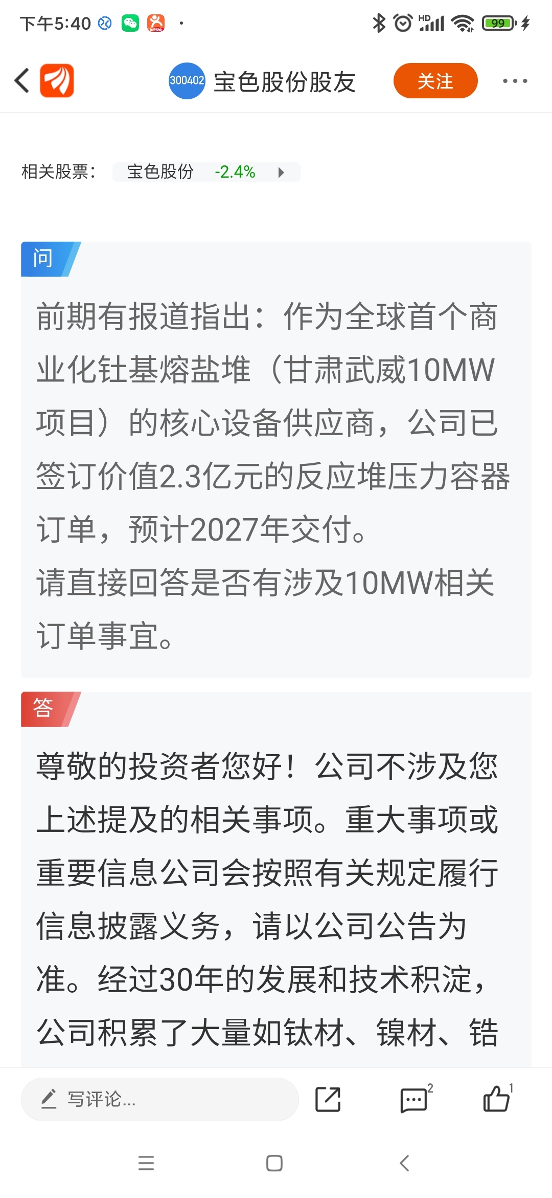 $宝色股份(SZ300402)$ 完了,董秘回答相当于公告没参与10兆瓦钍基熔盐堆项目!!!!!!!!!!!!!
