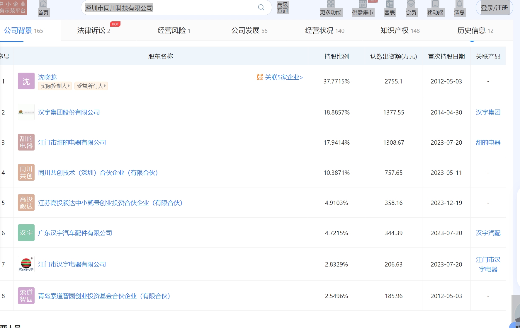 深圳市同川科技有限公司汉宇集团通过4家公司共持股43.875%