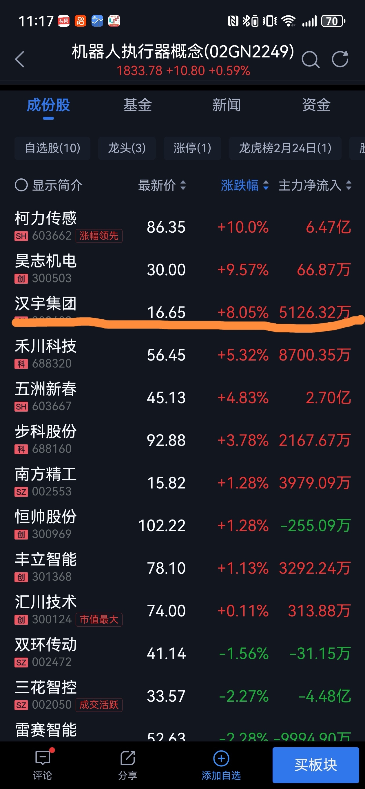 汉宇业绩属实算优良啦!在机器人板块里边。股价几乎是最低的,在机器人执行器板块里边